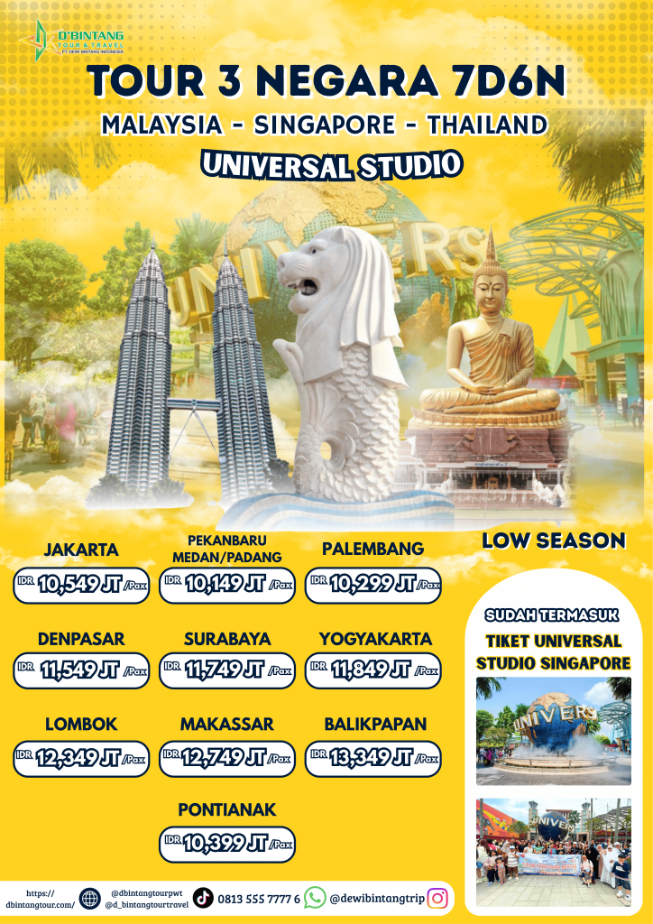 Dalam perjalanan tour 3 negara ini, Anda akan mengunjungi berbagai kota wisata terkenal seperti Johor Bahru, Singapore, Kuala Lumpur, Melaka, Hatyai, hingga Dannok Thailand. Salah satu highlight utama perjalanan ini adalah menikmati wahana seru di Universal Studios Singapore, taman hiburan kelas dunia yang menjadi favorit wisatawan.